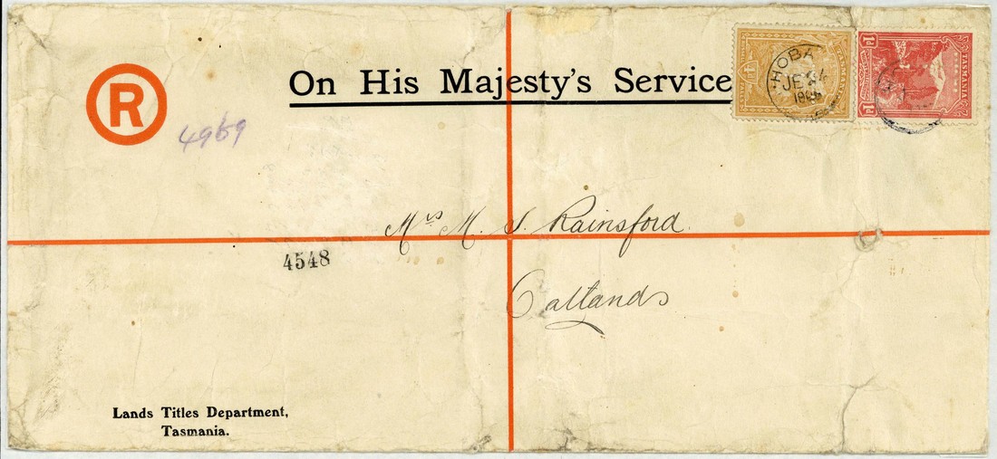 1908 (24 June) OHMS registered envelope (276x126mm.; faults) from the Lands Titles Department to Oatlands, bearing Pictorial 1d. and 4d. (both perforated "T") tied by Hobart c.d.s.; 1910 (19 Dec.) OHMS Savings Bank Packet Only registered envelope (279x124mm.) printed in red to Hobart, bearing Pictorial 1d. perforated "T" tied by Williamsford c.d.s., fine