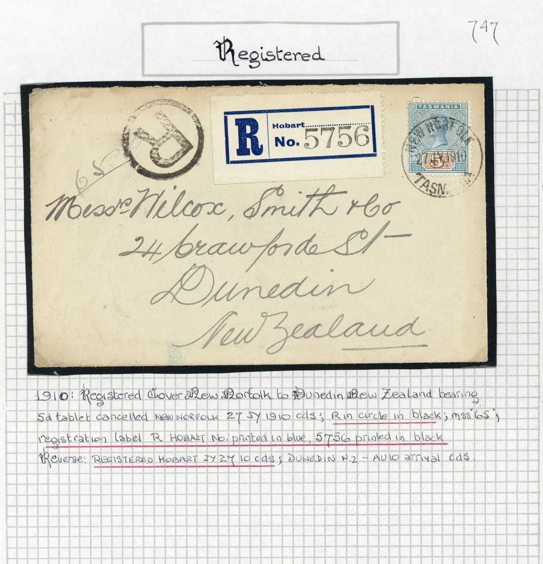 1910 (27 July) envelope registered from New Norfolk to Dunedin, bearing keyplate 5d. tied by c.d.s., showing "R" in circle and Hobart registration label; 1912 (24 Oct.) envelope registered from Campbell Town to Dunedin, bearing Pictorial 4d. clearly tied by c.d.s. and showing registration label at upper left