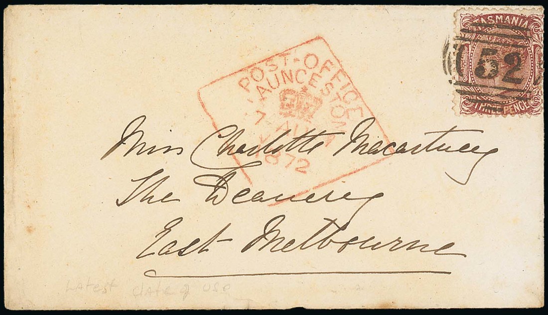 1875 (7 Aug.) envelope to Melbourne, bearing Sideface 3d. clearly tied by "52" barred numeral, showing diamond-framed "post-office/launceston" d.s. in red used as an outward ship letter marking. Scarce. Photo