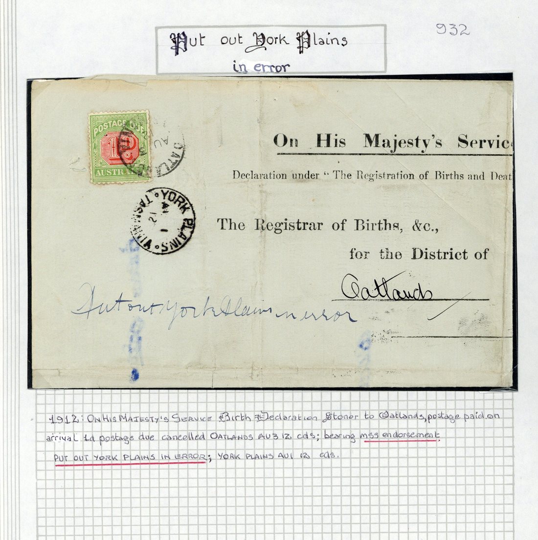 A miscellaneous group of envelopes (2), Official mail (2), picture postcards (2) and loose stamps/pieces including 1901 and 1908 pieces showing framed "too late"; 1905 Pictorial Letter Card from Scotland to Queenstown, bearing GB ½d. (2) and showing manuscript "Received in this condition at Queenstown"; 1909 picture postcard from Shipwrights Point to Hobart bearing Pictorial 1d. and showing manuscript "Mail Room"; 1910 Official "Registration of Births" from Mt. Farrel to Waratah showing manuscript "Post Free"; and 1912 Official "Registration of Births" to Oatlands, showing manuscript "Put out York Plains in error", showing York Plains c.d.s. and bearing Postage Due 1d. applied and cancelled on arrival