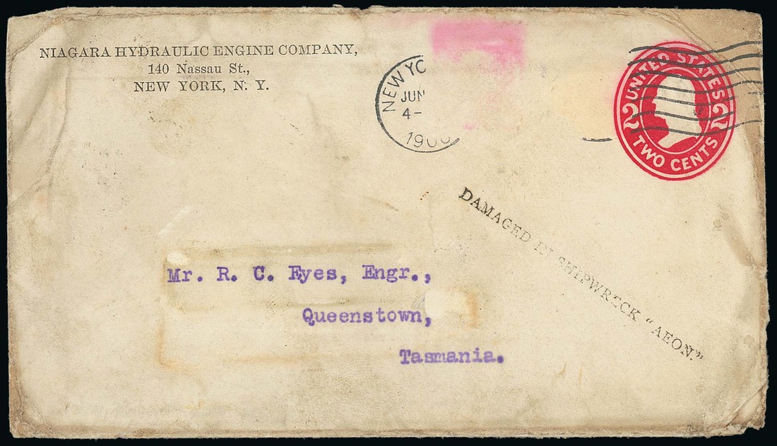 1908 (June) U.S. 2c. stationery envelope (additional stamps missing) from New York to Queenstown, showing a fine strike of the rare "damaged in shipwreck "aeon"" with San Francisco transit d.s. and "v. (Arms) "r./found open/..../officially sealed" label (torn through opening) tied by arrival d.s. on reverse. Photo