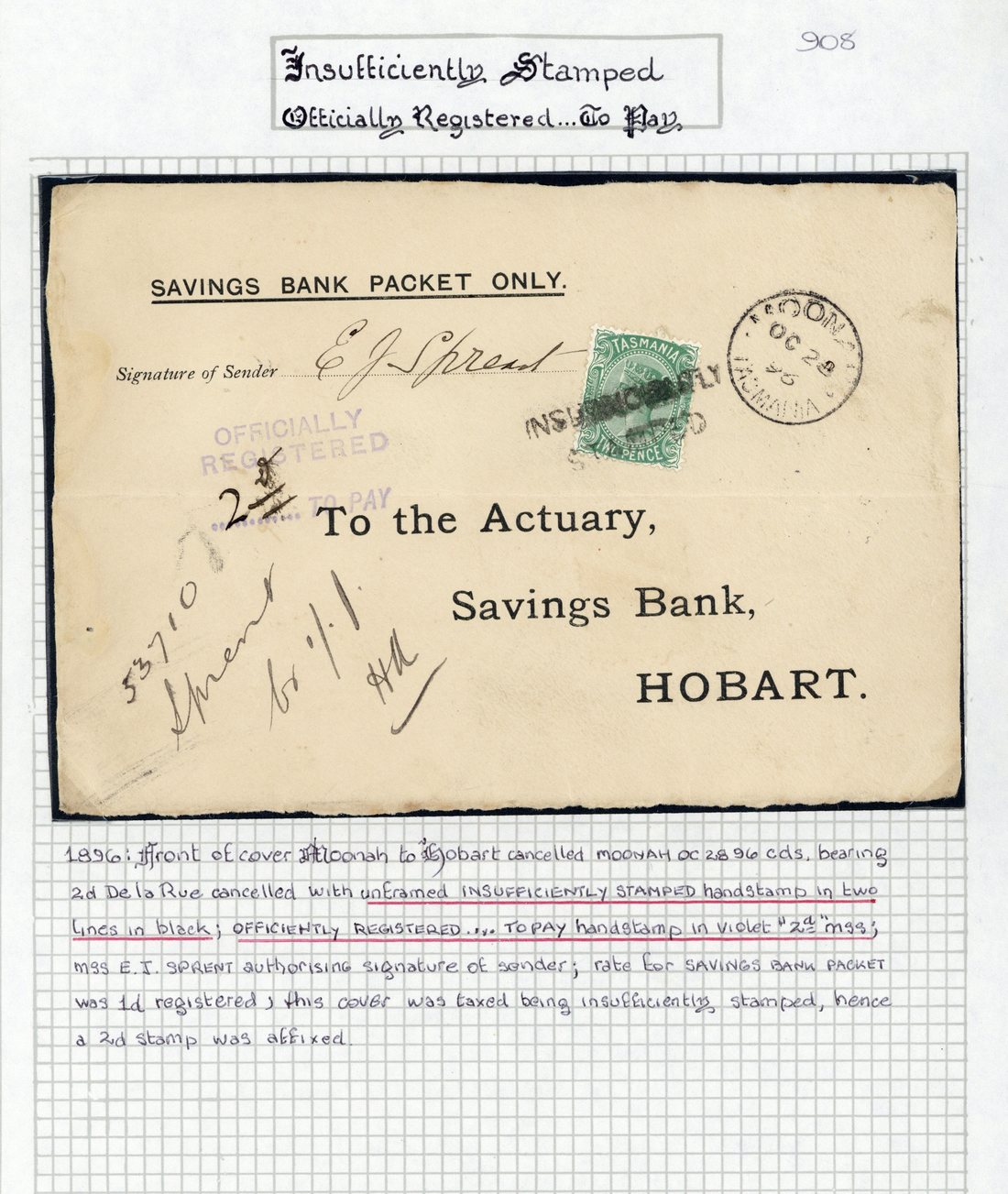1896 (Oct.) front from Moonah to Hobart, bearing Sideface 2d. tied by unframed "insufficiently/stamped" h.s. with despatch c.d.s. alongside and showing "officially/registered/.....to pay" h.s. in blue with manuscript "2d" inserted; also eleven loose stamps/pieces all with adhesives similarly cancelled