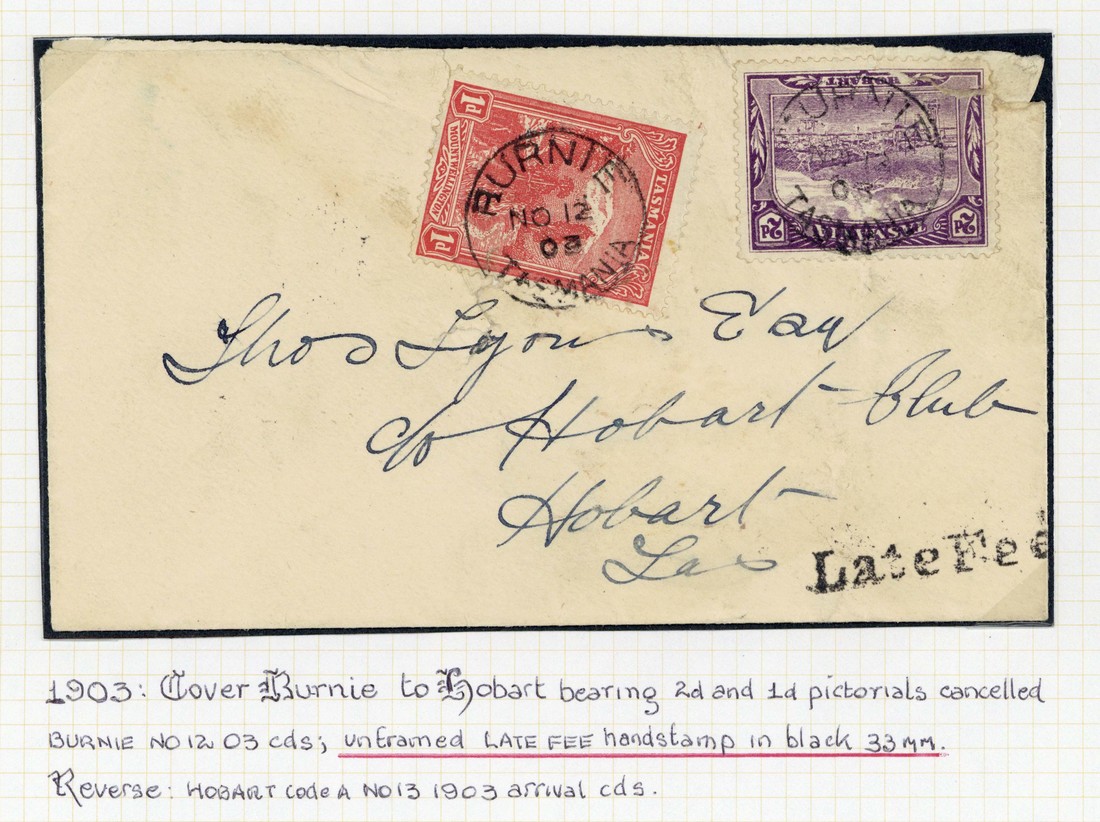 1903 (12 Nov.) envelope (spiked and with corner fault) from Burnie to Hobart, bearing Pictorial 1d. and 2d. (defective) and showing fine "Late Fee" h.s.; 1904 (9 Feb.) envelope (spiked) from Burnie to Hobart, bearing Pictorial 1d. and 2d. and showing manuscript "Late Fee"; also Commonwealth piece bearing KGV 1d. pair on piece cancelled by framed "late fee"