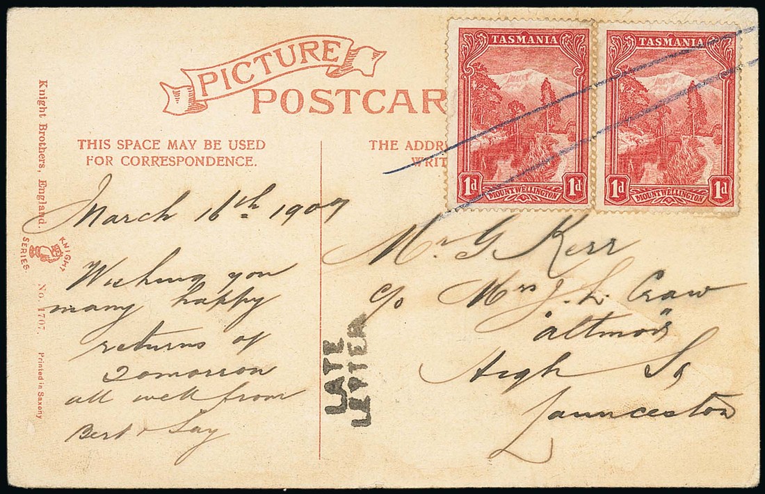 1907 (16 Mar.) picture postcard to Launceston, bearing Pictorial 1d. (2) crossed by two blue crayon strokes, showing fine unframed "late/letter" h.s.; also loose Sideface 1d., 2d. (3) and 4d. each cancelled by similar handstamp. Photo