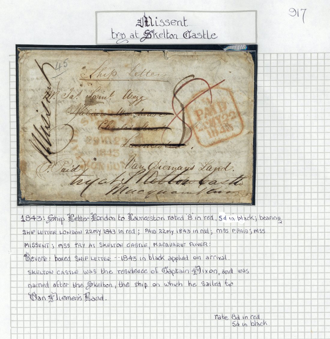1843 (22 May) entire (a little stained and with other minor faults) from London to Launceston, rated "8" in red (deleted) and "5", showing despatch Paid and Ship Letter datestamps in red, with manuscript "Missent" at left and "try at Skelton Castle, Macquarie River"; also undated entire to Captain Allison, Avoca (he actually lived at Macquarie River), marked "Missent" and signed, re-addressed to Lake River and again marked "Missent Try McQueenie, J.F. Fletcher";