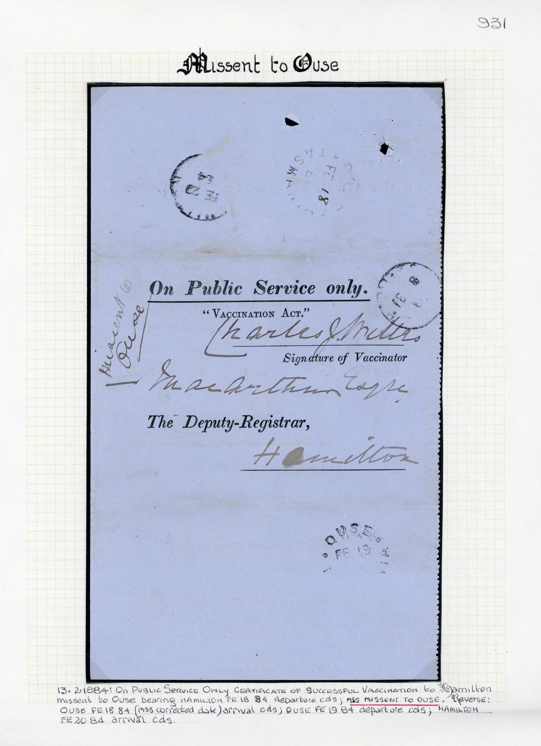 1884 (Feb.) and 1886 (Nov.) official "Vaccination Act" certificates to Hamilton, showing manuscript "Missent to" Ouse and New Norfolk respectively, the latter initialled