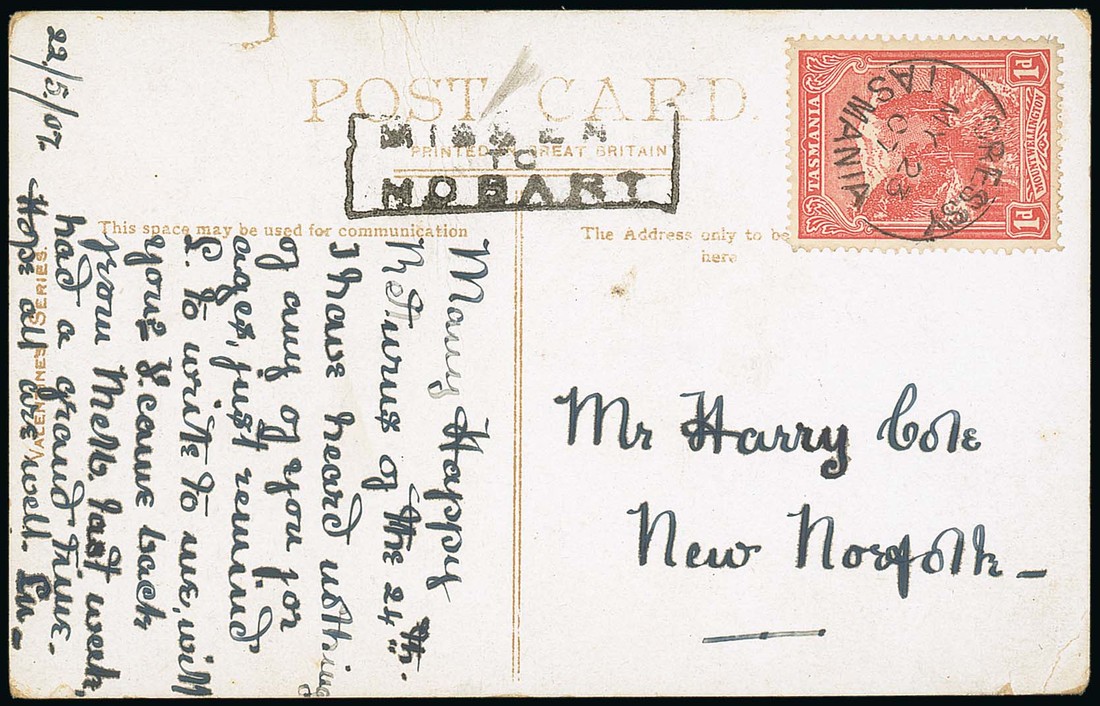 1907 (May) postcard from Cressy to New Norfolk, bearing Pictorial 1d. and showing rare framed "missent/to/hobart" alongside. Photo