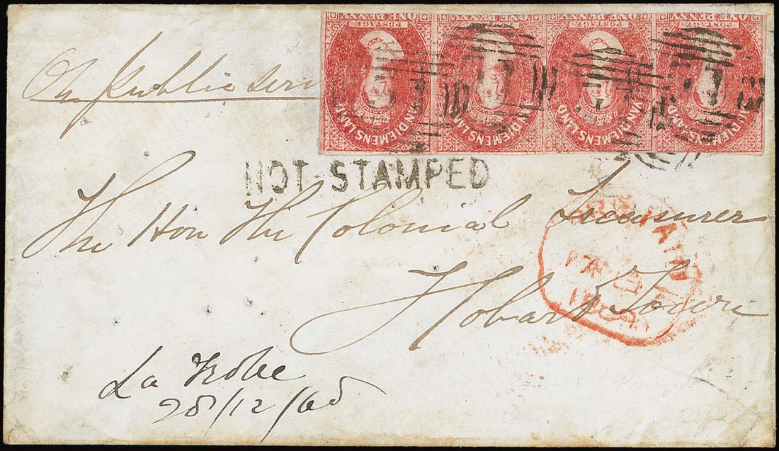 1868 (28 Dec.) stampless envelope from LaTrobe to Hobart, marked "On Public Service Only", showing "51" numeral at upper right, manuscript "La Trobe 28/12/68" at lower left and, on reverse, Launceston diamond-framed "post-office/launceston" and "free" datestamps in red (29.12). The status of the letter was then rejected with unframed "not stamped" h.s. applied on face and returned to LaTrobe. The letter was then franked with1857-67 1d. carmine strip of four which was affixed at right only and cancelled "51", then re-forwarded to Launceston (5.2), reaching Hobart two days later; the envelope with some pinholes. Rare. Photo