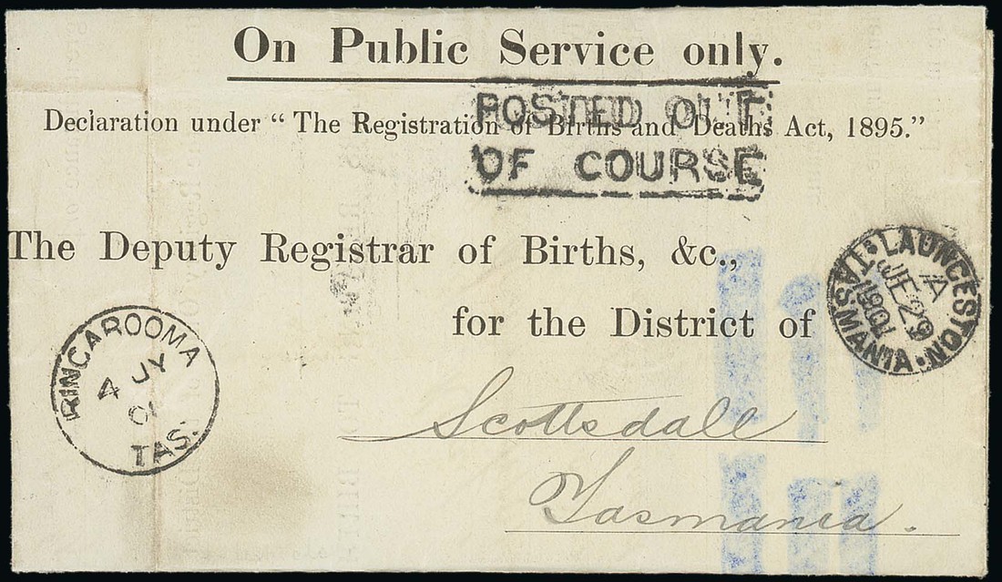 1901 (29 June) official Birth Declaration from Launceston to Scottsdale, showing despatch c.d.s., large framed "posted out/of course", Ringarooma c.d.s. (4.7) with Scottsdale d.s. (29.6) on reverse. Photo