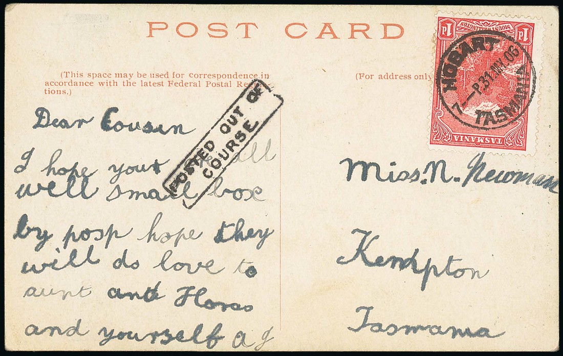 1906 (31 May) picture postcard from Hobart to Kempton, bearing Pictorial 1d. and showing fine small framed "posted out of/course" h.s. Photo