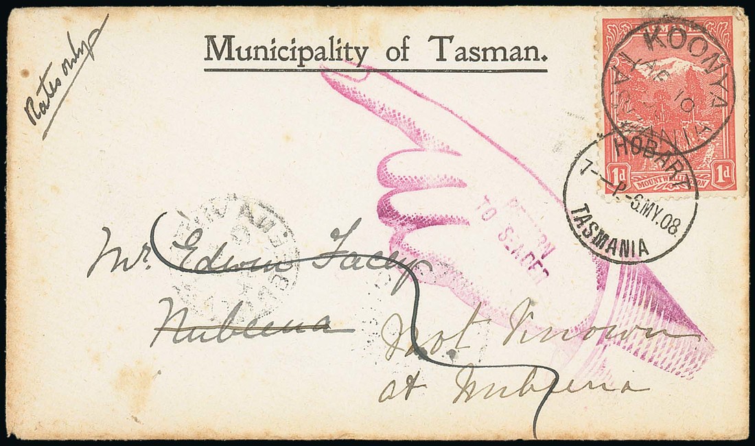 1908 (10 Apr.) "Municipality of Tasman" envelope from Koonya to Nubeena, showing manuscript "Not known at Nubeena" showing large "pointing finger" "return/to sender" h.s. in red with Dead Letter Office d.s. on reverse; envelope with some minor peripheral soiling. Photo