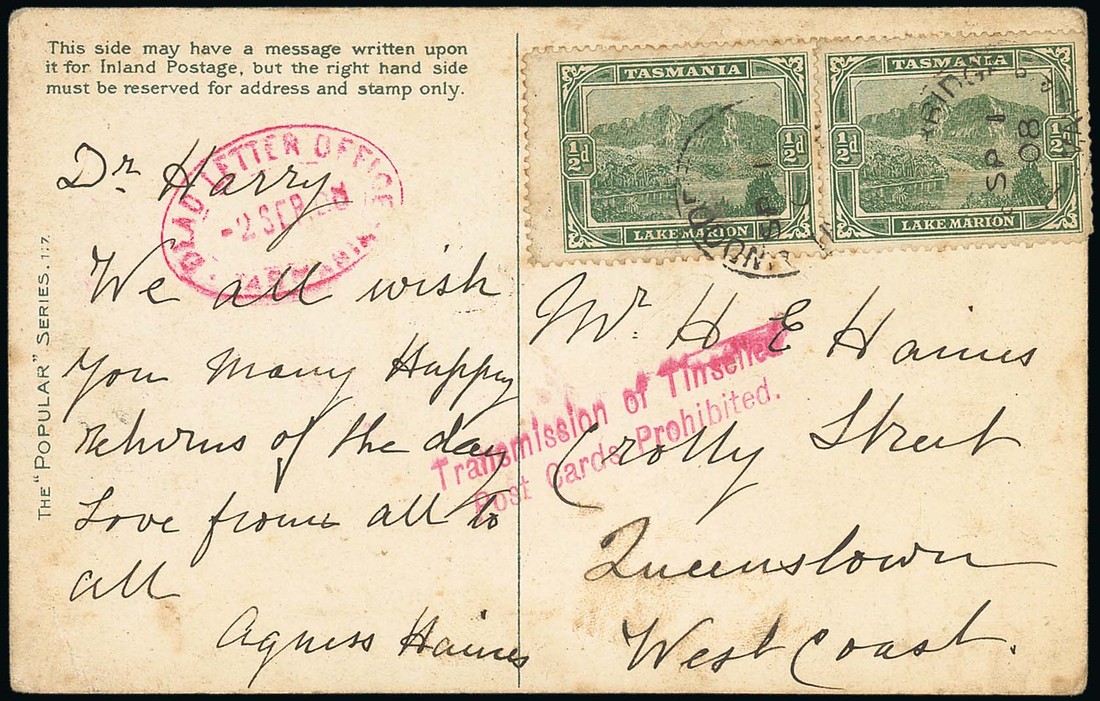 1908 (1 Sept.) tinselled picture postcard from Woodbridge to Queenstown, bearing Pictorial ½d. (2), showing fine "Transmission of Tinselled/Post Cards Prohibited." and "dead letter office/tasmania" oval d.s., both in red. Scarce. Photo
