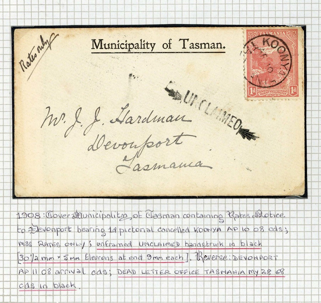 1907-09 envelopes (7, two OHMS and five "Municipality of Tasman"), one from Victoria the others all internal and bearing Pictorial 1d., four showing "unclaimed" h.s. (three different types) and three with manuscript "Unclaimed"; all with some minor discolouration though a good lot
