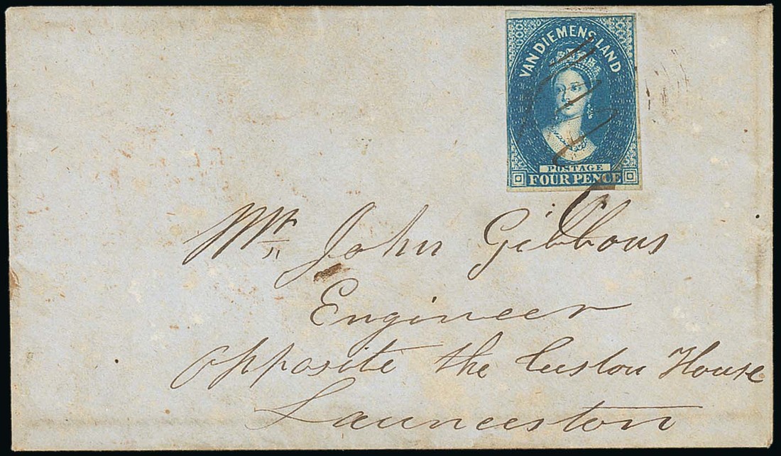 1857 (Jan.) envelope addressed to "Mr John Gibbons, Engineer, Opposite the Customs House, Launceston", bearing 1857 (4d. (cut-into at sides) cancelled by manuscript squiggle and showing, on reverse, framed arrival "pre-paid" d.s. in red; the envelope a little soiled. Photo