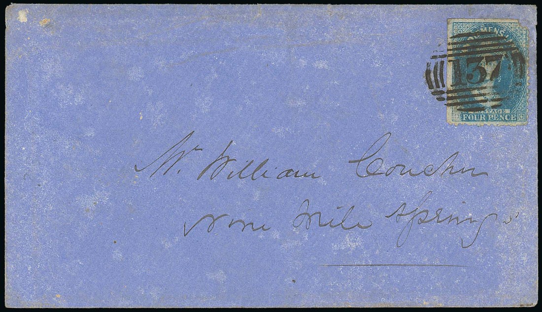 1870? envelope addressed to "Mr William Coucher, Nine Mile Springs", bearing Chalon 4d. clearly tied by "137" barred numeral of Back Creek, no other postal marking; the envelope a little damp spotted. Photo