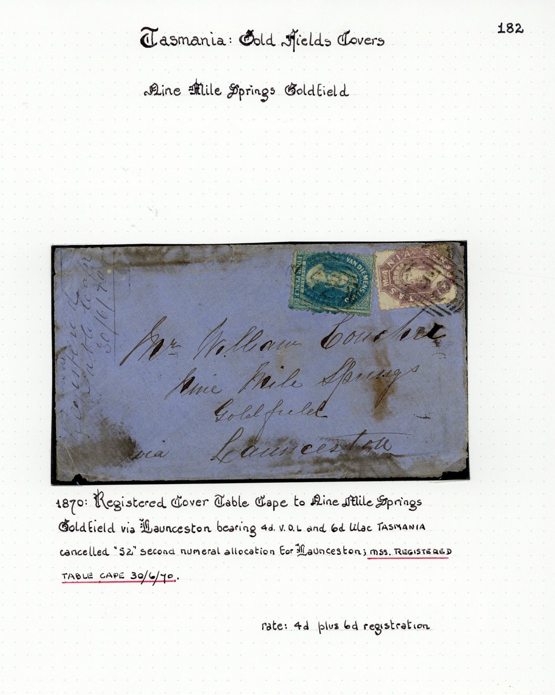 1870 (July)-71 envelopes (5) addressed to Mr William Coucher at Nine Mile Springs (4) or Black Creek Diggings including 1870 (July) bearing Chalon 4d. and 6d. cancelled "52" and showing manuscript "Registered Table Cape 30/6/70" at left, 1870 envelope (3) each bearing Chalon 4d., two cancelled "52" and one with poor "87" and 1871 bearing Sideface 2d. cancelled "52"; condition mixed