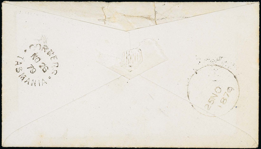 1879 (25 Nov.) envelope from Hobart to Swansea, bearing Sideface 2d. pair tied by duplex, showing unframed "late/letter" h.s., arrival c.d.s. and, on reverse, unnamed c.d.s. (Type "J") and Corners transit c.d.s. Neat and attractive. Photo
