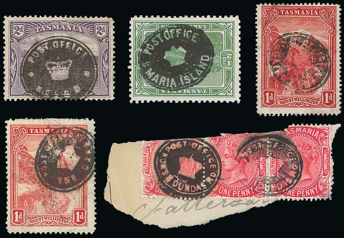 A small group, all mounted and written-up on pages, mainly on Sideface and Pictorial values, covering sixteen different offices, generally good to superb strikes including Kelso, The Oaks, Maria Island, Mount Heemskirk and North Dundas Bay. Photo for selection