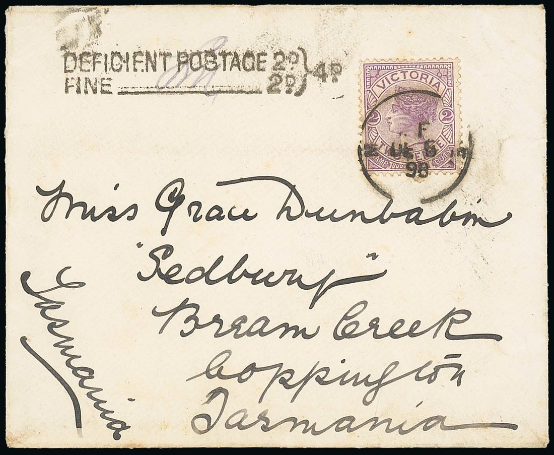 1898 (5 Dec.) envelope from Melbourne to Bream Creek, bearing Victoria 2d. and showing very fine "deficient postage 2d/fine____2d/4d" h.s. alongside with arrival datestamp on reverse. Photo