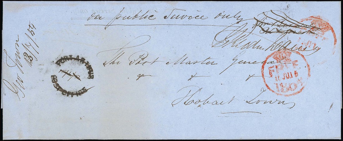 1854 official entire from Hobart to Port Arthur showing poor "free" d.s. in red; upon arrival the entire "turned" and addressed back to Hobart, signed by franking officer, missent to George Town, showing circular undated "port arthur/post office" with manuscript date "15/6/54" inserted (all deleted) with manuscript "Geo Town, 13/7/54" alongside and two strikes of Hobart "free" c.d.s. in red (15.6 and 14.7).. Rare. Photo