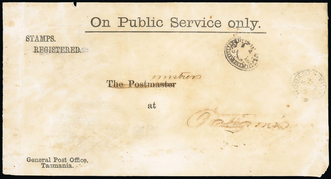 1886 (11 Jan.) General Post Office, Tasmania official envelope (240xx128mm) with printed "stamps./registered", used from Hobart to Oatlands, showing despatch c.d.s. and oval "stamps office/Crown/general post office" intaglio seal; the envelope with light discolouration. Photo