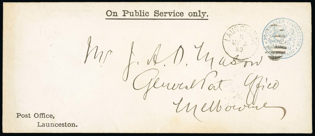 1889 (3 May) official Post Office, Launceston envelope (222x95mm) with red embossed seal on flap, addressed to Melbourne, showing fine "postmaster launceston/Arms/tasmania/frank stamp" in blue cancelled by Launceston duplex and showing arrival datestamp on reverse. The only impression recorded on a genuinely postally used cover. Photo