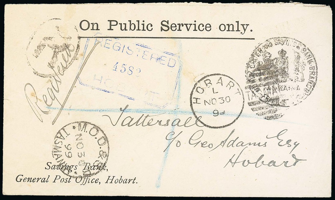 1899 (30 Nov.) locally addressed and registered official Savings Bank, General Post Office, Hobart envelope, showing "money order and savings bank branch/Arms/tasmania/frank stamp" in black cancelled by duplex, showing framed "registered/hobart" h.s. in blue and "m.o.o.&s.b." c.d.s.; the envelope spiked and with pinholes in left half. Photo