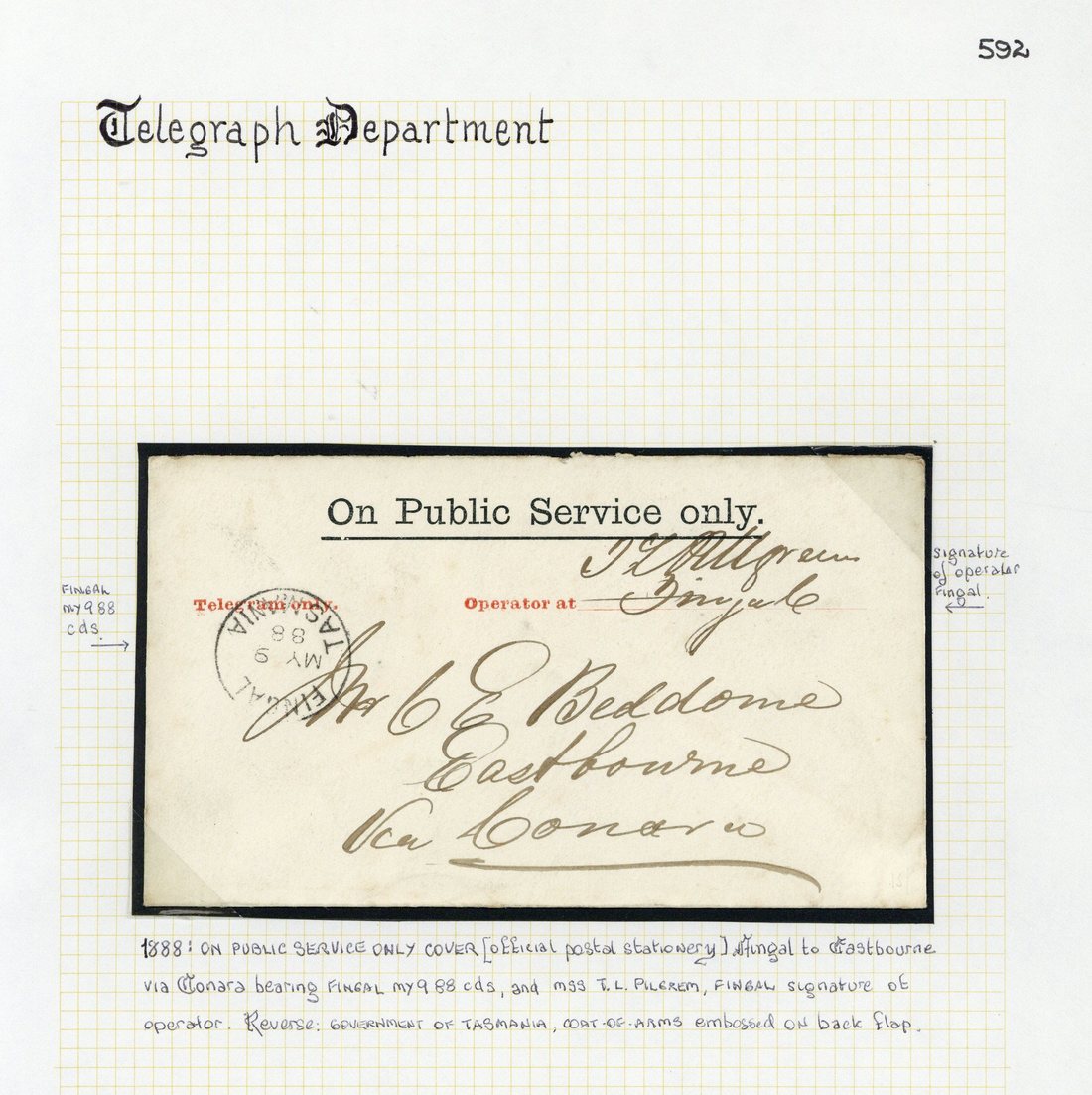 1888 (9 May) OPSO envelope with printed "Telegram only." and "Operator at ___" in red, used from Fingal to Eastbourne; 1895 (19 July) envelope from Hobart to Launceston with signature at lower left; 1897 Telegraph message form used at Hamilton; and 1898 (4 June) official Post and Telegraph Department, Tasmania envelope used from Wynyard to Launceston