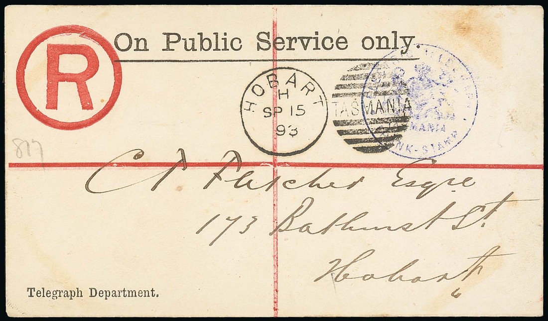1893 (15 Sept.) locally addressed and registered Telegraph Department envelope with blue embossed seal on flap, showing "electric telegraph/Arms/tasmania/frank stamp" in violet cancelled by Hobart duplex. Photo