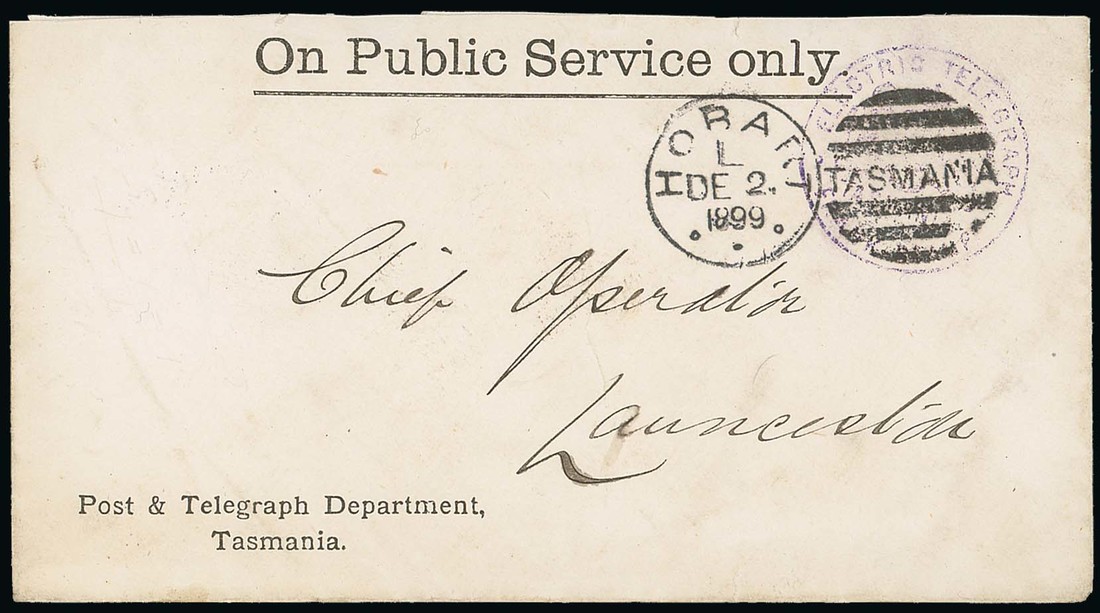 1899 (2 Dec.) official Post & Telegraph Department, Tasmania envelope used from Hobart to Launceston, showing "electric telegraph/Arms/tasmania/frank stamp" in violet cancelled by a little heavy duplex; also 1894 (27 July) official Telegraph Department envelope (a little fox spotted and with piece missing at top) used from Hobart to Sorell, showing "electric telegraph/Arms/tasmania/frank stamp" in blue cancelled by heavy duplex. Photo for first