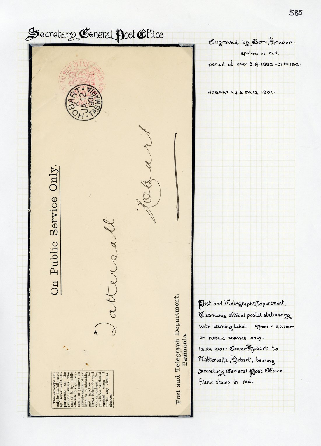1901 (12 Jan.) and (21 Feb.) official Post and Telegraph Department, Tasmania envelopes with warning label (220x98mm approx) addressed locally and to A.F. Basset Hull in Sydney, both showing "secretary general post office/Arms/tasmania/frank stamp" in red and in black respectively cancelled by Hobart c.d.s.; the former with some light creases and pinholes at upper left, the latter with the odd minor fox spot