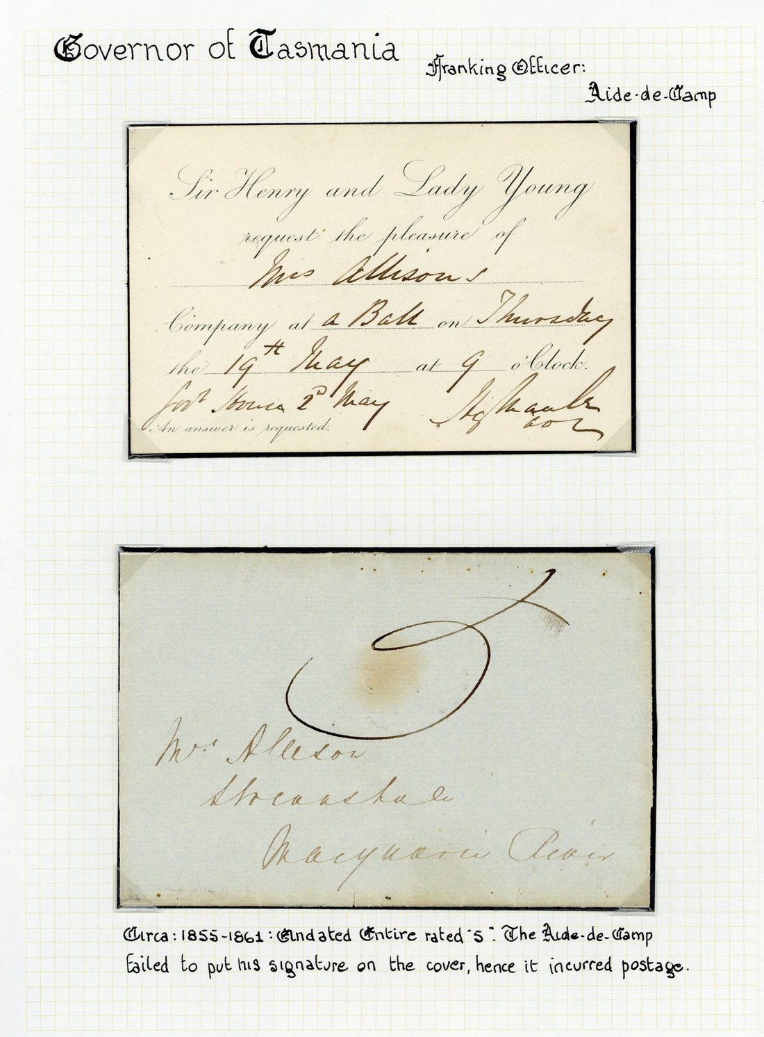 c. 1855-61 undated entire containing an invitation to a ball held by Sir Henry and Lady Young signed by the Aide-de-Camp, Henry Maule, the entire rated "5" as it was without a signature; also 1854 entire (badly damaged) to Launceston containing and invitation from the Aide-de-Camp to a ball celebrating the Queen's birthday