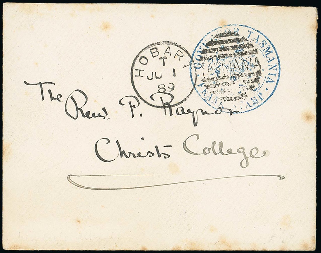 1889 (1 June) locally addressed envelope showing "governor tasmania/Arms/tasmania/frank stamp" in blue cancelled by Hobart duplex; the envelope with the odd minor tone spot. Photo