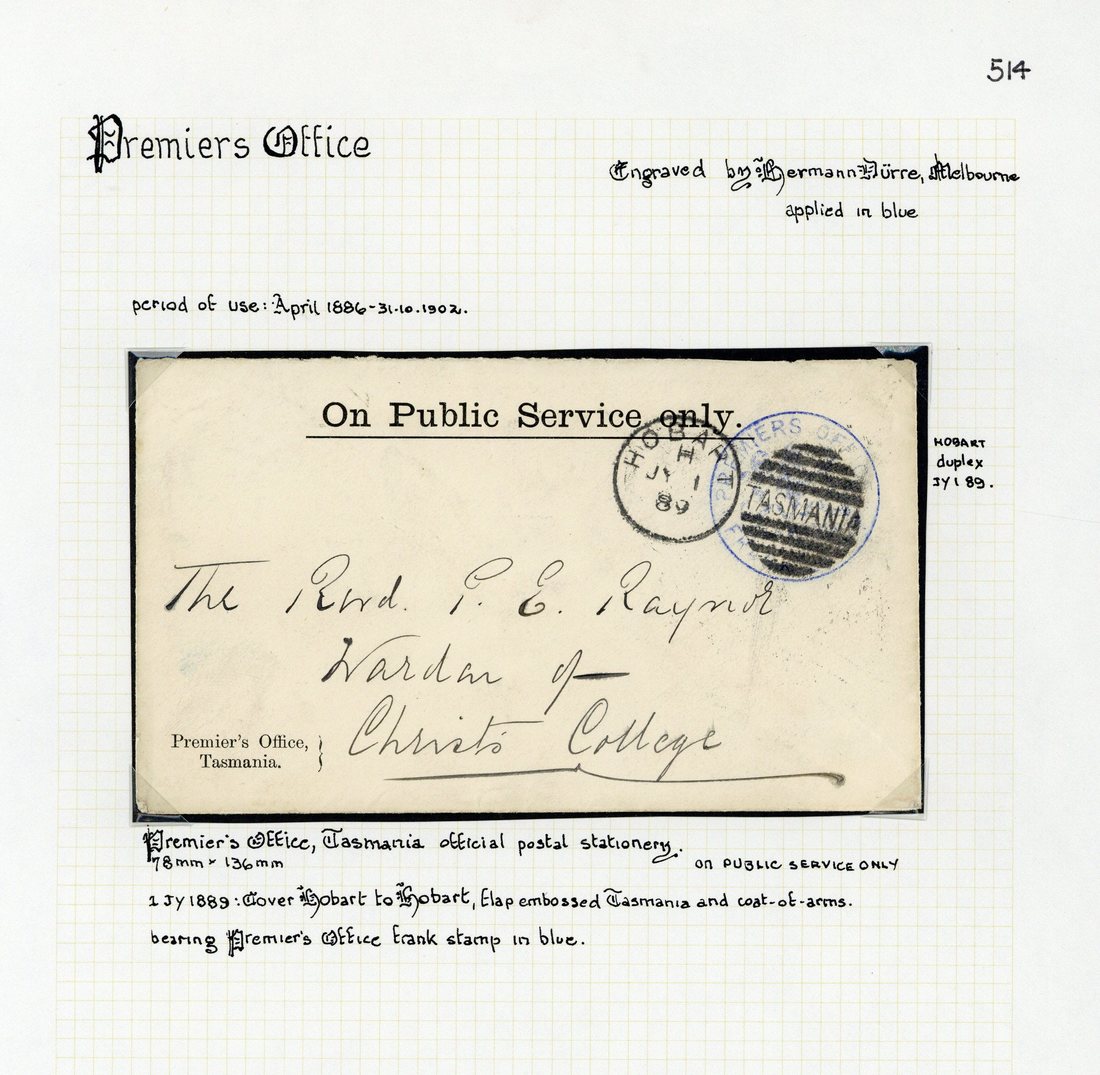 1889 (1 July) and 1896 (27 Oct.) official Premier's Office, Tasmania envelopes, the former locally addressed and showing "premiers office/Arms/tasmania/frank stamp" in blue cancelled by Hobart duplex, the latter addressed to Launceston showing a light strike of the Frank Stamp cancelled by Hobart duplex; also two pieces showing impressions of the Frank Stamp in violet, plus 1908 OHMS Premier's Office, Tasmania envelope to Launceston, bearing Pictorial 2d. perforated "T" tied by Hobart c.d.s.