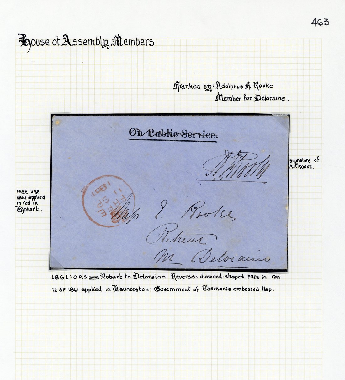 1861 (11 Sept.) "On Public Service" (deleted) envelope to Deloraine, signed A.F. Rooke, showing despatch "free" c.d.s. and, on reverse, Launceston diamond-framed "free" d.s., both in red