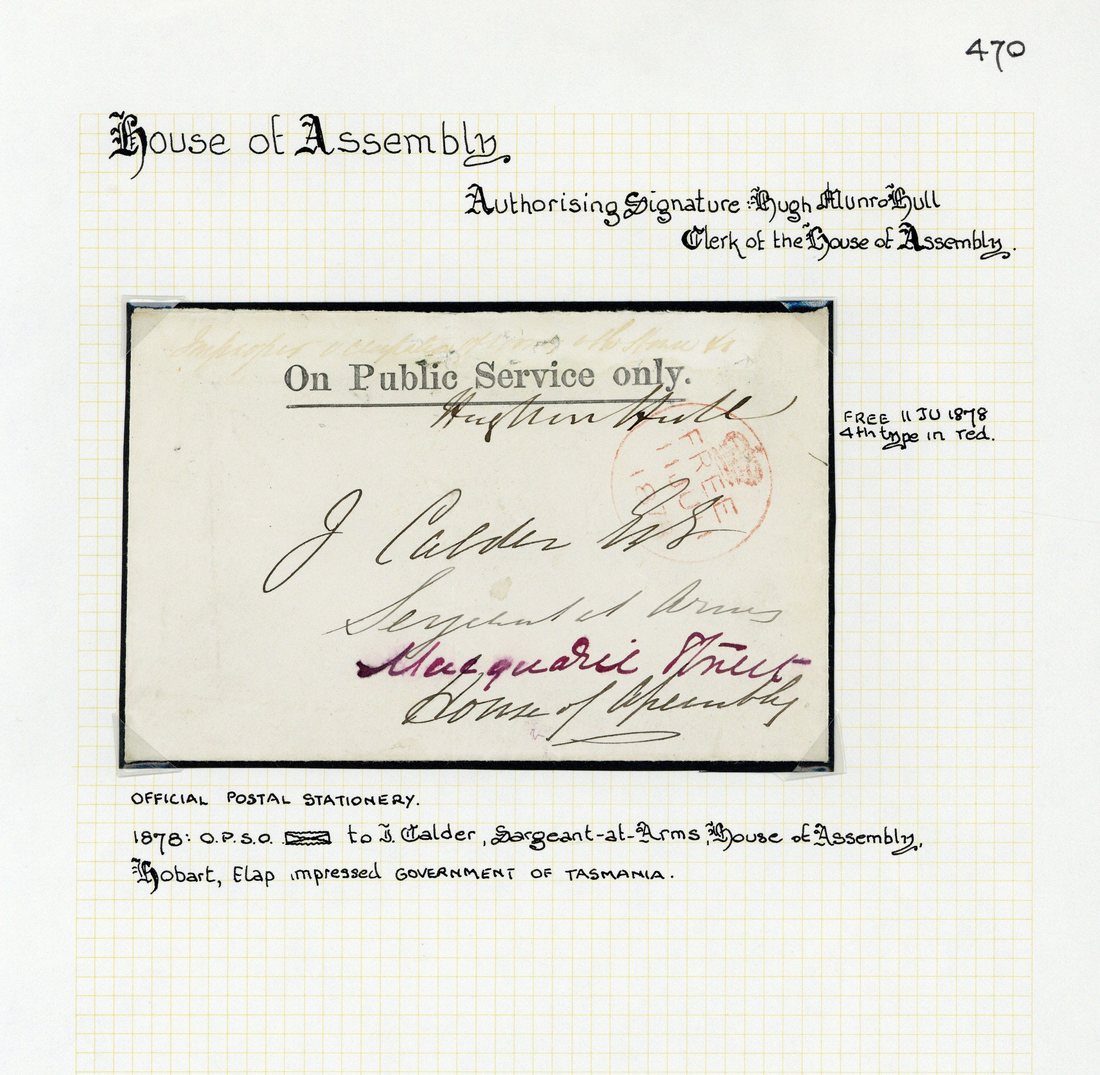 1878 (11 June) locally addressed official envelope, signed by Hugh Munro Hull, showing "free" c.d.s. in red; 1883 (28 July) envelope to London (addressee's name excised), signed by William Archer, showing diamond-framed "free" d.s. in black; 1887 (5 Aug.) envelope (repaired at top) to Torquay, signed by James Dooley and showing Hobart c.d.s.; 1900 (1 Aug.) official envelope (225x95mm; roughly opened at top) to Carnarvon, signed by Williams Woollnough and showing Hobart c.d.s.; 1902 (27 Aug.) and (28 Aug.) (2) envelopes to Swansea, signed by John Stieglitz, Carmichael Lyne and Thomas Walduck