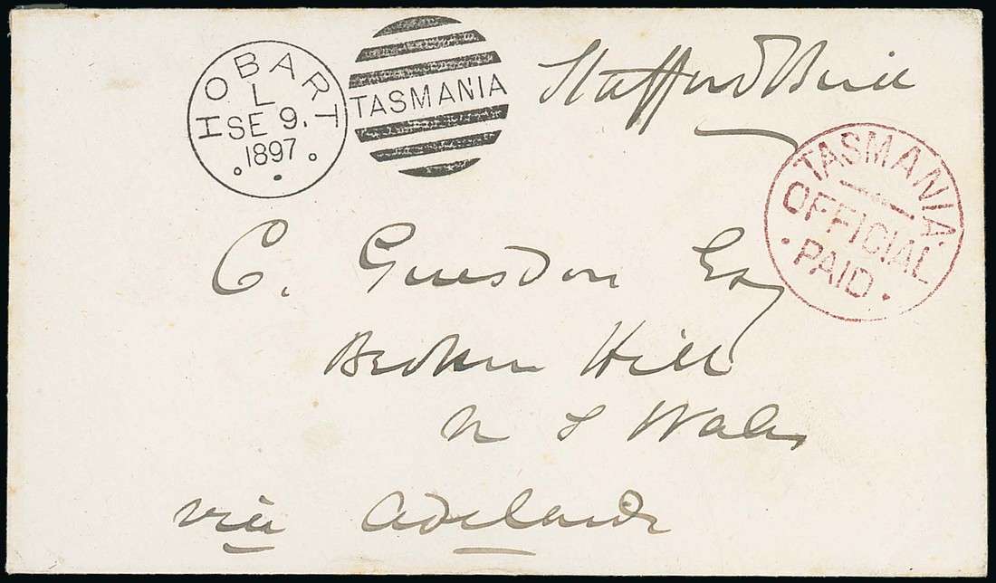 1897 (9 Sept.) envelope to Broken Hill, signed by Stafford Bird, showing Hobart duplex and "tasmania/official/paid" circular h.s. in magenta with, on reverse, Adelaide and arrival datestamps. Neat and attractive. Photo