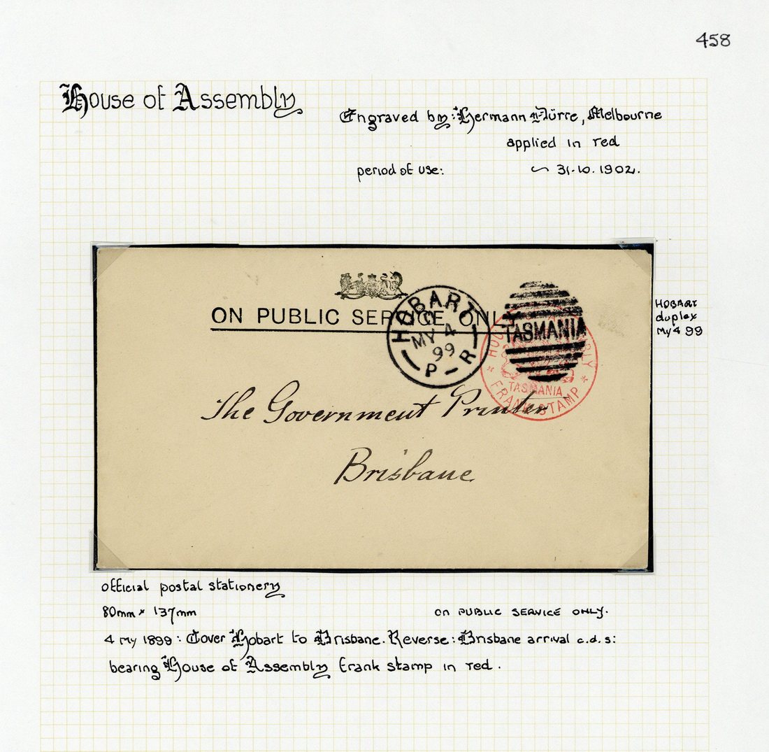 1899 (4 May) official envelope to Brisbane, 1899 (8 July) official House of Assembly, Tasmania envelope (253x128mm) addressed locally; and 1900 (7 July) official House of Assembly, Tasmania envelope (253x128mm) with warning addressed locally; each showing "house of assembly/Arms/tasmania/frank stamp" in red cancelled by Hobart datestamp