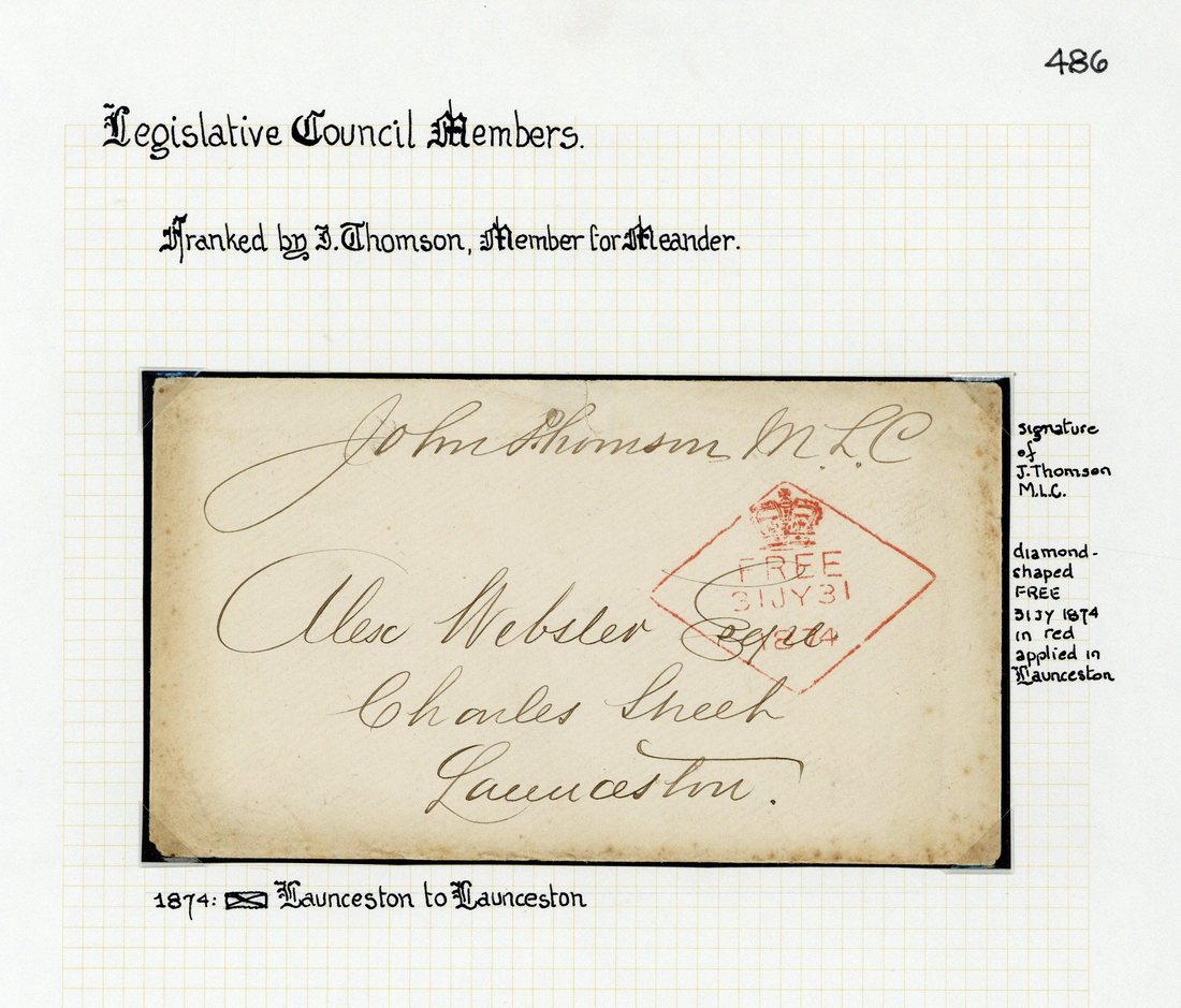 1874 (31 July) envelope (peripheral soiling) to Launceston, signed by John Thomson and showing diamond-framed "free" d.s. in red; 1874 (12 Aug.) and 1875 (2 Sept.) envelopes to Launceston, signed by J. Aikenhead and J. Maclanachan respectively and both showing "free" c.d.s. in red; 1901 (23 Sept.) official Legislative Council Papers, Tasmania envelope, addressed locally, showing "legislative council/Arms/tasmania/frank stamp" in blue cancelled by Hobart c.d.s.; also a piece and an unused official envelope showing strikes of the Frank Stamp in violet and black
