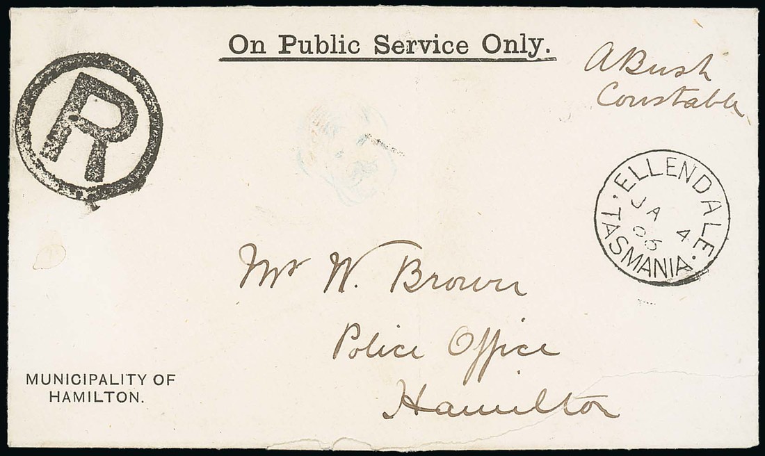 1896 (4 Jan.) official Municipality of Hamilton envelope registered from Ellendale to Hamilton, signed "A Bush, Constable", showing "R" in circle and fine despatch c.d.s. with arrival on reverse; the envelope with central vertical fold. Photo
