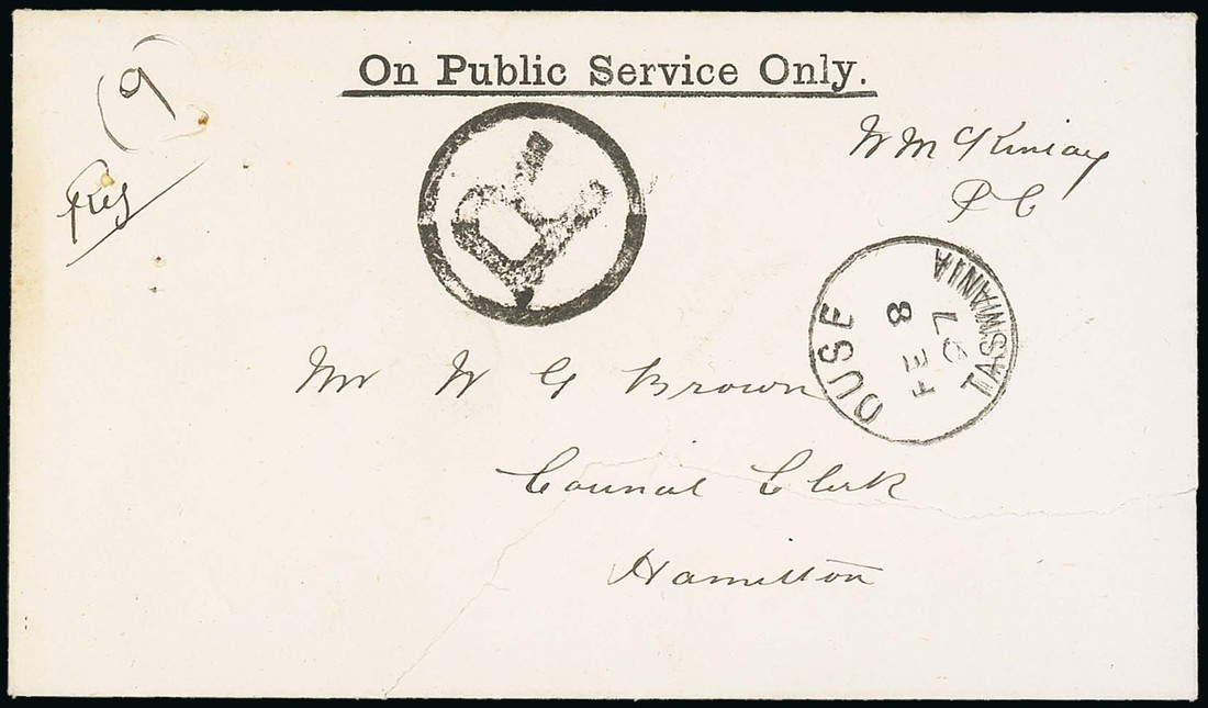 1897 (8 Feb.) official envelope registered from Ouse to Hamilton, signed "W.McKinlay, P.C.", showing despatch c.d.s. and "R" in circle with arrival datestamp on reverse; envelope with some pinholes at top left. Photo