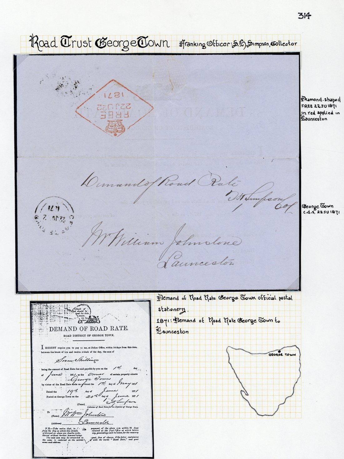 1871 (22 June) printed "demand of road rate, road district of george town" addressed to Launceston, signed by S.H. Simpson, Collector, showing despatch double-arc d.s. with arrival "free" d.s. in red on reverse.