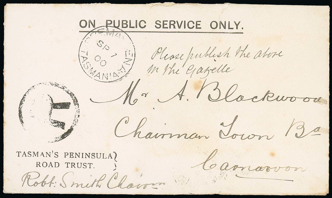 1900 (7 Sept.) official Tasman's Peninsula Road Trust envelope registered from Premaydena to Carnarvon, signed by Chairman, showing despatch c.d.s. and "R" in circle. Photo