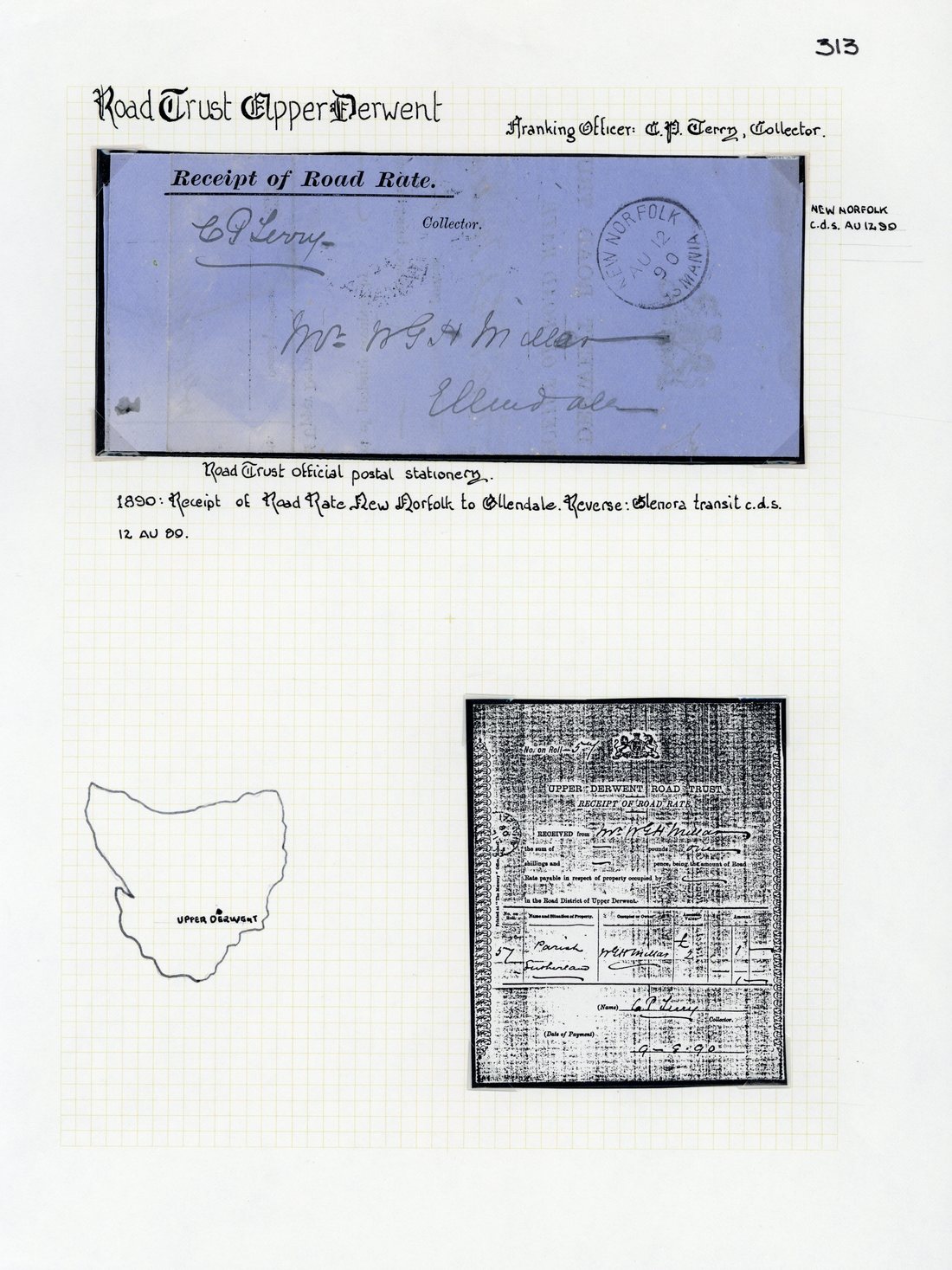 1890 (12 Aug.) "Receipt of Road Rate" for Upper Derwent, addressed to Ellendale, signed by Collector and showing fine New Norfolk c.d.s. with Glenora transit d.s. on reverse