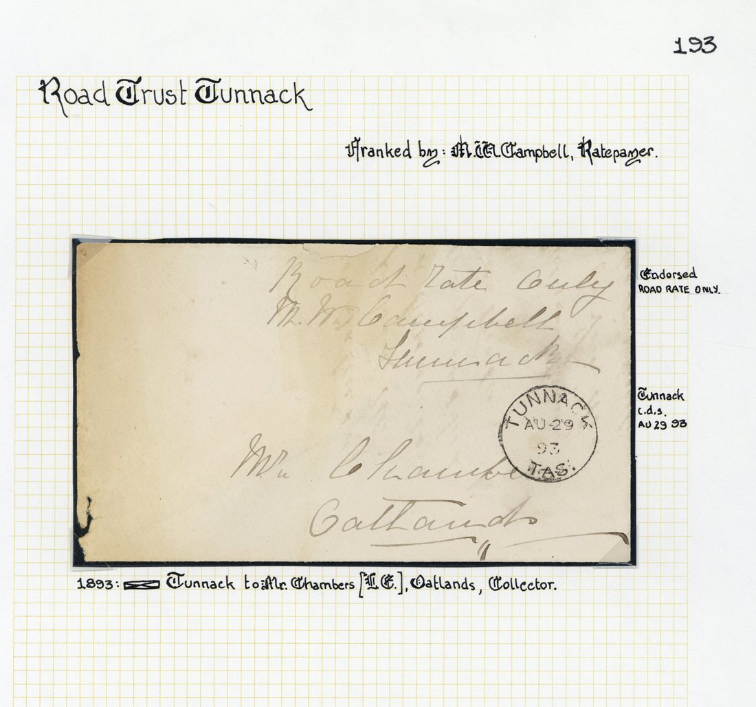 1893 (29 Aug.) envelope to Oatlands, headed "Road Rate Only" in manuscript, signed by Chairman of Tunnack Road Trust, showing fine despatch c.d.s. with arrival d.s. on reverse; the envelope a little soiled and with peripheral faults at left