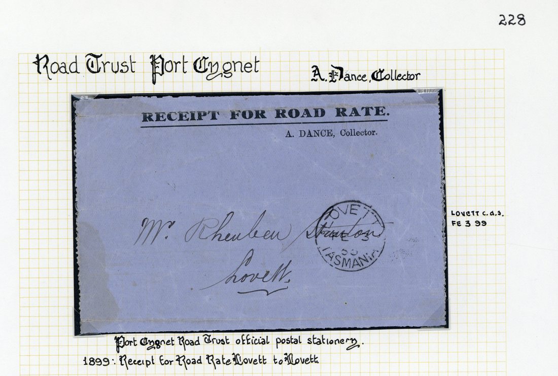1899 "receipt for road rate" (2) from Port Cygnet Road Trust to Lovett, both with printed name of Collector and showing Lovett datestamp