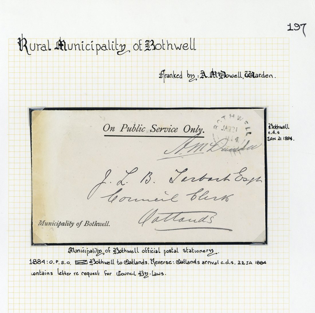 1884 (21 Jan.) official Municipality of Bothwell envelope (with contents; light discolouration at left) to Oatlands, signed by Warden and showing Bothwell despatch double-arc d.s.; 1898 (22 July) official Ross Municipality envelope registered to Hobart, signed by Warden, showing Ross c.d.s. and "R" in circle