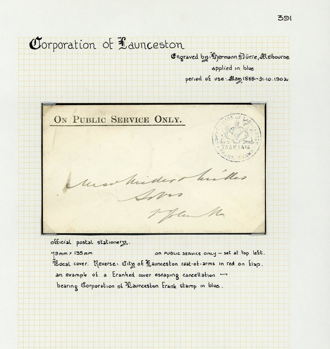 Undated official envelope (City arms on flap), addressed locally, showing a good strike of uncancelled "corporation of launceston/Arms/tasmania/frank stamp" in blue; 1894 (27 Mar.) official envelope (221x100mm) with City arms on flap, addressed to Sydney, showing good strike of "corporation of launceston/Arms/tasmania/frank stamp" in blue cancelled by duplex; 1895 (15 May) official envelope (minor fox spots) addressed locally, showing "corporation of launceston/Arms/tasmania/frank stamp" in blue cancelled by duplex; and 1897 (Apr.) official envelope (tear at right) to Burnie, showing "corporation of launceston/Arms/tasmania/frank stamp" in blue cancelled by duplex