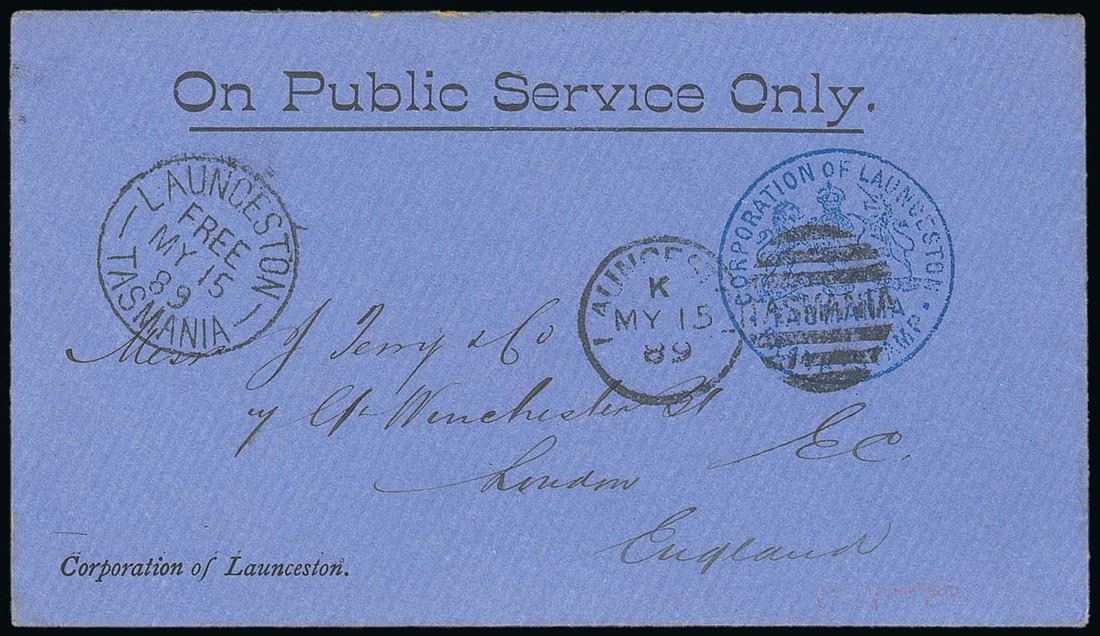 1889 (15 May) blue official Corporation of Launceston envelope addressed to London, showing fine "corporation of launceston/Arms/tasmania/frank stamp" in blue cancelled by duplex and fine "launceston/free/tasmania" c.d.s. Photo