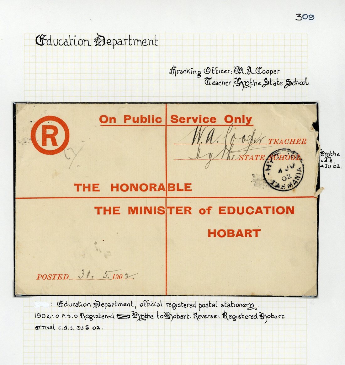1902 (4 June) official Education Department registered postal stationery envelope printed in red (177x112mm.), used from Hythe to Hobart and signed by Teacher at Hythe State School; also 1903-07 official Education Act, Tasmania notices (3) each bearing Pictorial 1d. , one perforated "T"